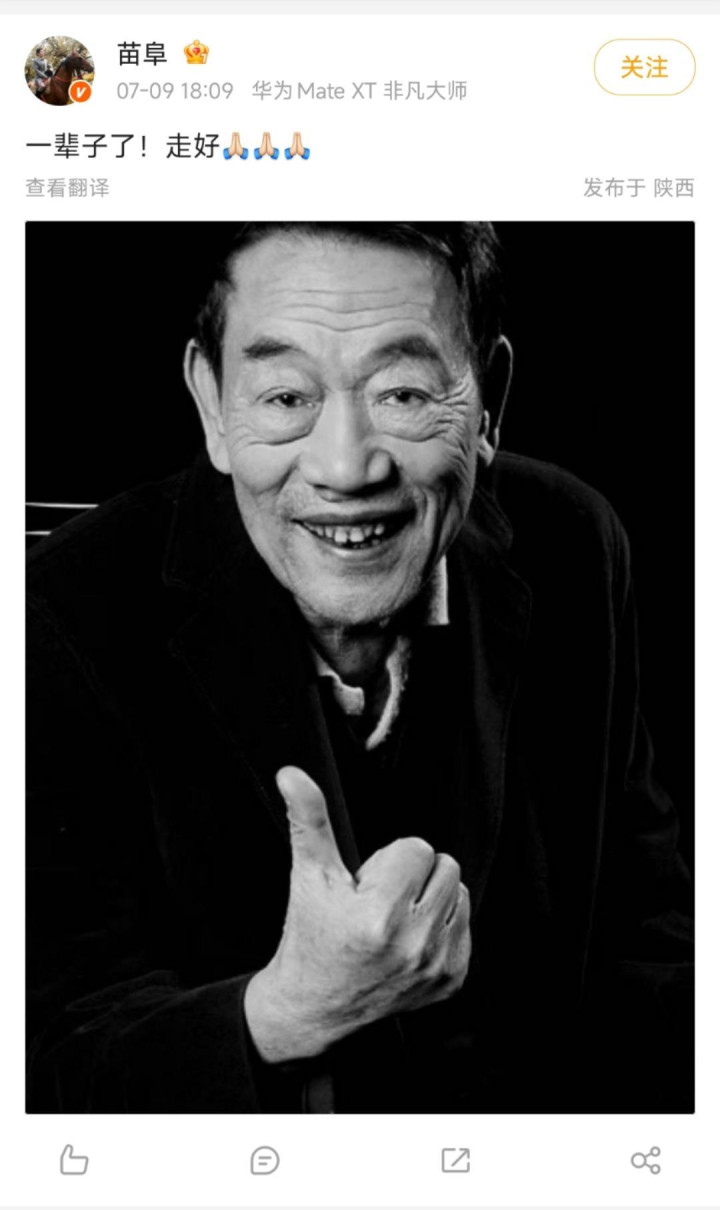 9日傍晚,苗阜曾在微博发布悼念杨少华的博文:“一辈子了!走好。”
